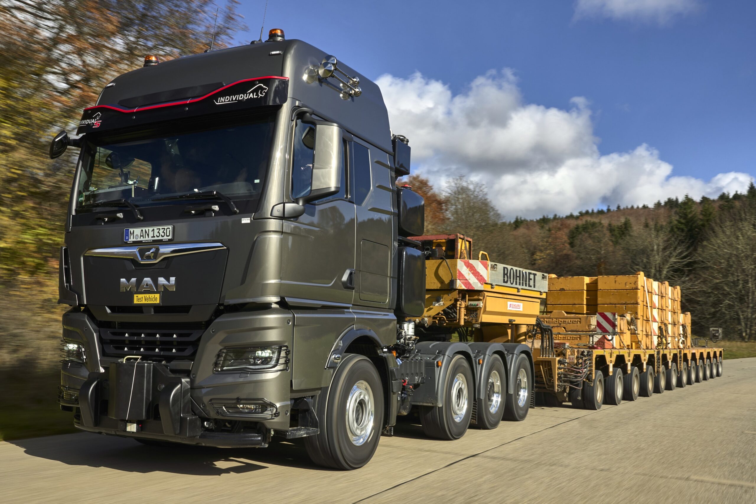 Szélerőművek több száz tonnás turbinái, esetleg transzformátorok házastul, netán egy egész tengeralattjáró? Semmi gond, szállítható! S hogy mivel? Hát például az MAN új négytengelyes nehézvontatójával! A VIARENT kínálatában egyelőre kéttengelyes kivitelében szereplő MAN TGX most a mélyágyas, soktengelyes speciális pótkocsik elé készült verziójában mutatkozott be.